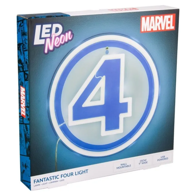 Decora tu espacio con la espectacular lámpara de pared LED con logo neón de los Fantastic Four. Con sus medidas compactas de 24 x 24 x 2 cm, es perfecta para cualquier rincón del hogar. Este producto oficial licenciado por Marvel es ideal para los verdaderos fans de los héroes más emblemáticos.