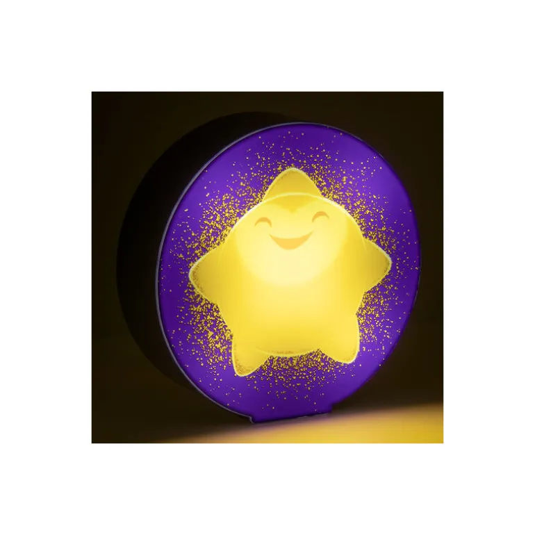 Descubre esta fascinante lámpara con diseño de estrella, que destaca por su brillante color amarillo. La estrella luce una cara sonriente que seguro traerá alegría a cualquier habitación. El fondo de la lámpara es de un azul oscuro con destellos amarillos, simulando un cielo estrellado, creando un ambiente relajante y mágico.