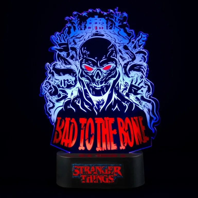Ilumina tu espacio con la Lámpara LED de Mesa Stranger Things Bad to the Bone, un artículo imprescindible para los fans de la exitosa serie. Esta lámpara presenta un diseño impactante, con una figura en ABS y metacrilato que muestra una calavera rodeada de sombras y una casa en un fondo misterioso.