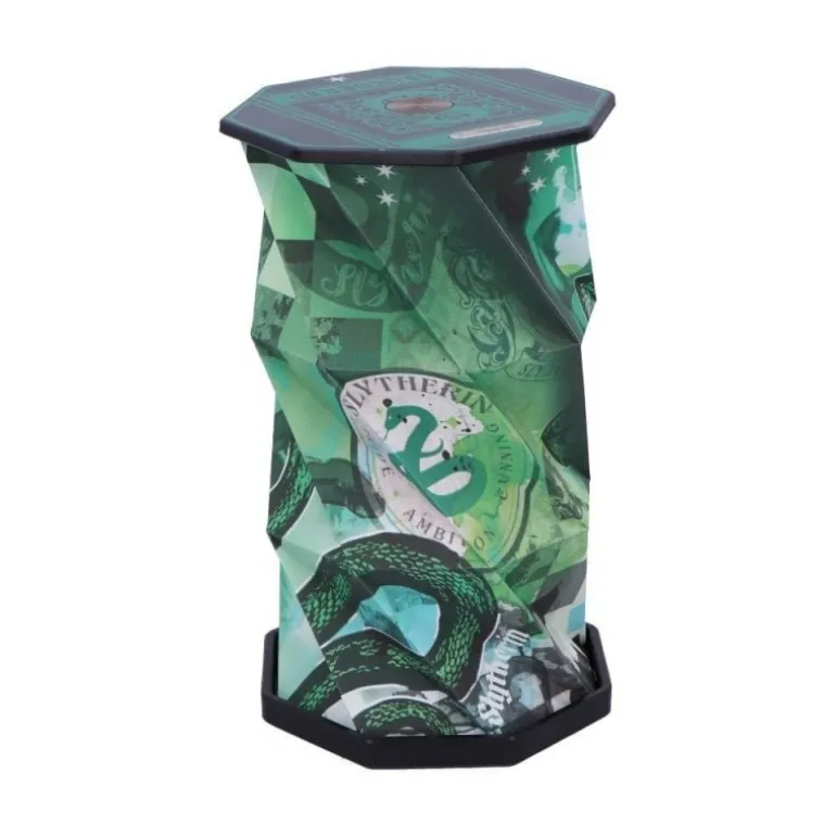 La lámpara presenta un diseño en vibrantes tonos verdes emblemáticos de la casa Slytherin, con detalles del escudo y la serpiente en un patrón geométrico que resalta su estilo único. Su estructura plegable permite un fácil almacenamiento y transporte, convirtiéndola en un regalo original ideal para cualquier entusiasta del mundo mágico de Harry Potter.