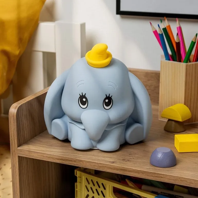 Descubre la lámpara Dumbo SquishyGlo, una encantadora pieza de decoración inspirada en el entrañable personaje de Disney. Esta lámpara de 15 cm de altura tiene forma de elefante, con un diseño suave y esponjoso gracias a su material de silicona.