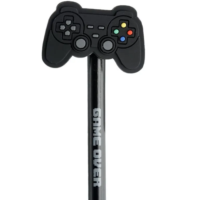 El diseño detallado del lápiz, que incluye un «Game Over» y con el mando de la consola.
