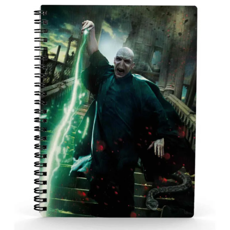 Una libreta que destaca nada más la ves por el cuidado diseño de su portada, con la imagen del mago más temido y tenebroso de la saga, Voldemort, usando su hechizo más poderoso: Avada Kedavra. Y lo mejor es que la foto es lenticular, por lo que cuando lo cambias de ángulo se genera un espectacular efecto 3D, y parece que están en movimiento. En el interior cuenta con un total de 80 páginas para que apuntes los hechizos y encantamientos que te apetezca.