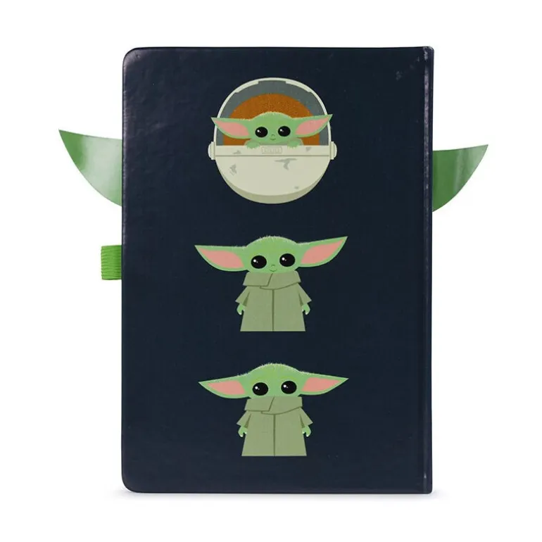 Una libreta que si por algo destaca es por su cuidado diseño, con una portada protagonizada por The Child, al que también conocemos como Baby Yoda, en ese capazo flotante tan especial, con su cabeza en relieve y esas orejitas que sobresalen por los lados de la portada. Y no te pierdas los dibujos de Grogu en la parte de detrás.