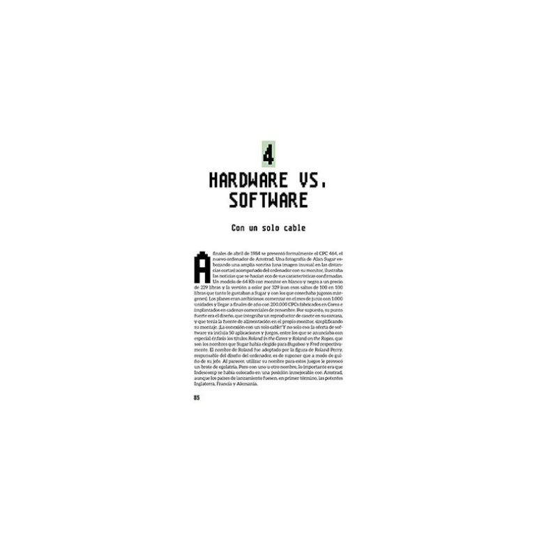 Dentro, se encuentran secciones bien definidas como «Hardware vs. Software», abordando la competencia y las estrategias detrás de los icónicos ordenadores como el CPC 464, complementado con imágenes a color de estos dispositivos emblemáticos. Ideal para coleccionistas y entusiastas de la tecnología clásica, este libro es un viaje al corazón de una compañía que cambió el panorama tecnológico en España. Con 256 páginas de pura historia empresarial, es un imprescindible para entender el impacto de Amstrad.
