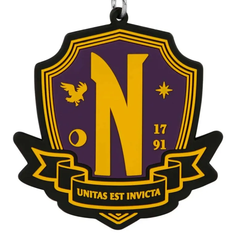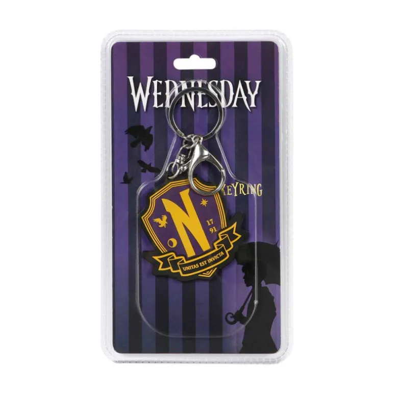 El Llavero Miércoles es un producto de alta calidad fabricado en PVC blando, que presenta el escudo de Nevermore Academy en su diseño. Con un efecto en anverso y reverso, este llavero cuenta con una anilla y gancho de metal que garantizan su durabilidad a lo largo del tiempo. Con unas dimensiones de 0,6 x 6 x 6 cm, este llavero es el regalo perfecto para los fans de Miércoles, ya que es original y útil para el día a día. Su diseño único y su practicidad lo convierten en un accesorio imprescindible para los amantes de la serie. ¡No pierdas la oportunidad de tener un pedazo de Nevermore Academy contigo en todo momento con este fabuloso llavero!
