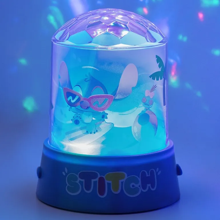 El producto cuenta con una cúpula transparente en la parte superior que dispersa las luces de colores en distintas direcciones, creando un efecto visual mágico. La base azul presenta el nombre de Stitch en colores alegres, agregando un toque divertido y estilizado. Es perfecta para ambientar eventos, decorar habitaciones de niños o simplemente disfrutar de una noche relajante en casa.