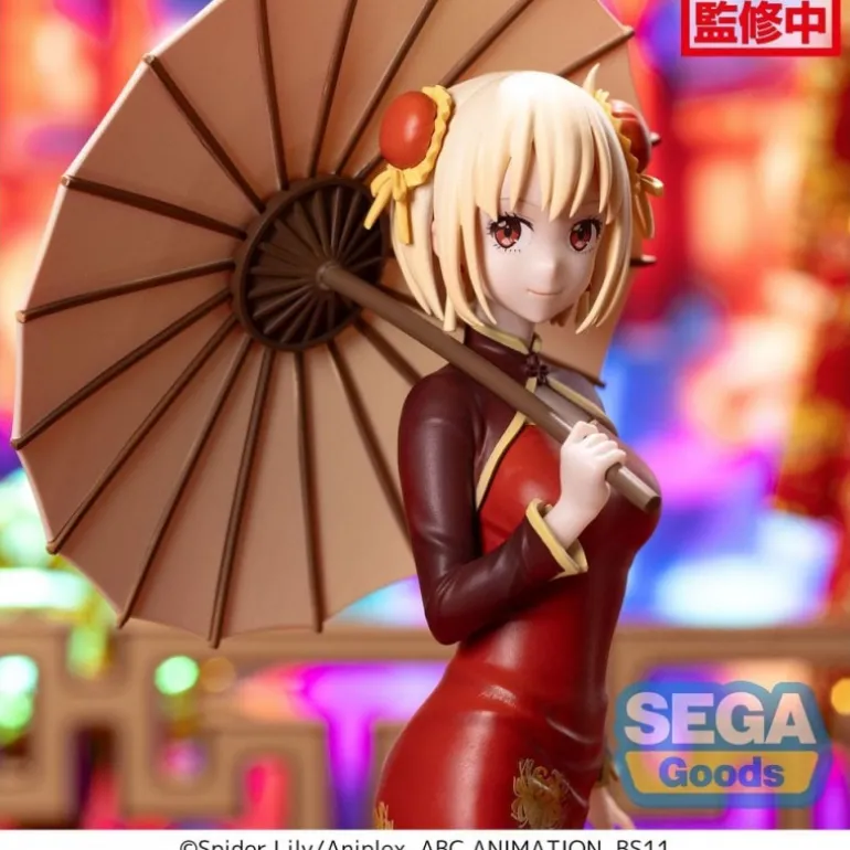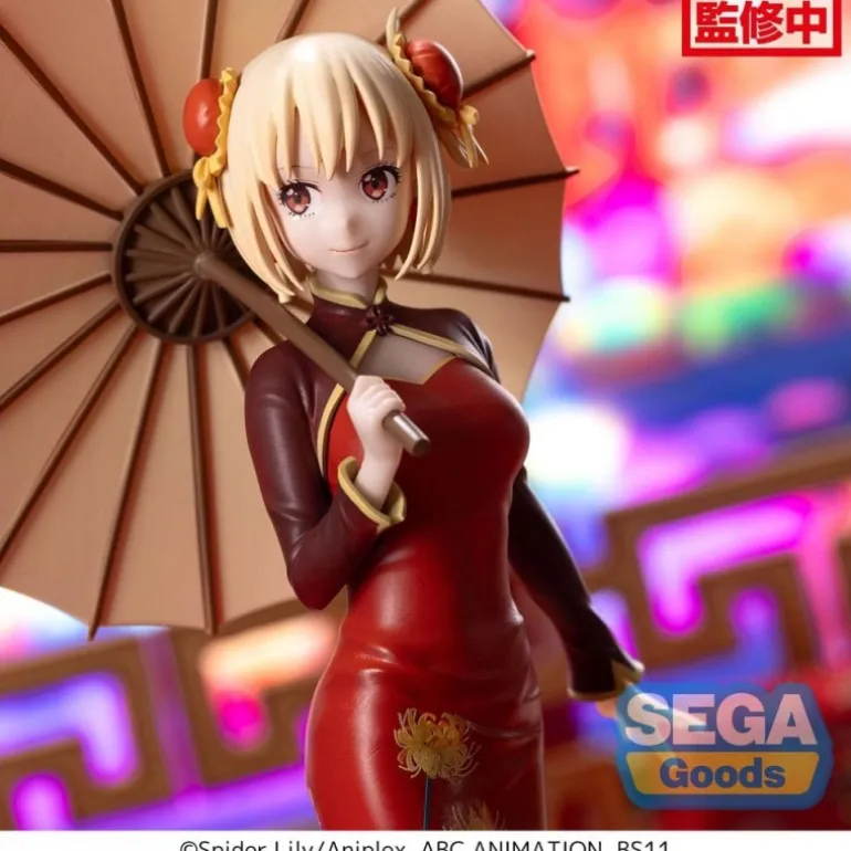El diseño presenta a Chisato con un elegante vestido rojo decorado con motivos dorados, sostenido por una base estable que complementa la figura a la perfección. Su pose es grácil, sosteniendo un parasol que añade un toque de distinción y autenticidad cultural. Ideal para coleccionistas, esta estatua es una pieza central para cualquier colección de figuras de anime.
