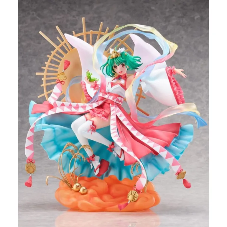 Descubre la exquisita estatua de Ranka Lee de Macross Frontier en su versión Amaterasu. Esta magnífica figura de PVC a escala 1/7 impresiona con sus 29,8 cm de altura y su vibrante paleta de colores que captura la esencia de la serie. Ranka Lee se muestra en una pose dinámica, con su característico cabello verde y un atuendo detallado en tonos rojos, blancos y rosas. La escultura se acompaña de un intrincado fondo dorado que emula un sol radiante, mientras luces y cintas danzan a su alrededor, añadiendo un toque etéreo.