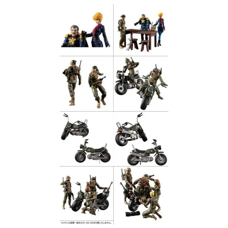 Descubre el increíble set de MegaHouse de la línea Gundam Military Generation (GMG), que incluye figuras detalladas y un vehículo móvil. Este pack es perfecto para los apasionados del universo Mobile Suit Gundam, ofreciendo una experiencia visual única con figuras de 10 cm de alto. El diseño meticuloso y la calidad de fabricación aseguran que cada figura sea un elemento llamativo en cualquier colección.