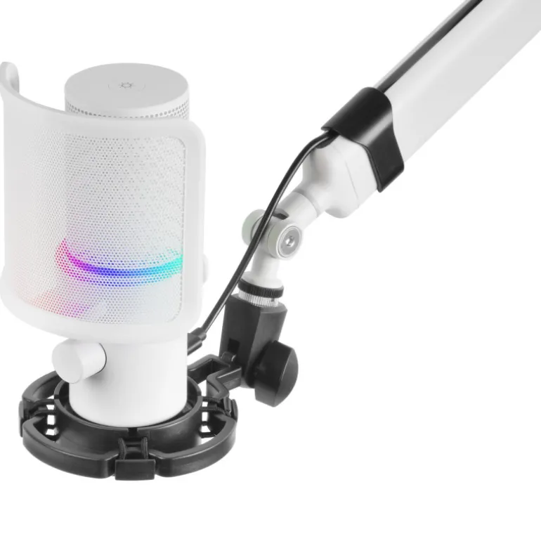Además, su diseño innovador cuenta con una iluminación DYNAMIC ARGB RING que le da un toque de estilo y personalidad a tu espacio de trabajo. Su brazo mecánico sólido y ajustable omnidireccional te permite posicionar el micrófono de forma precisa y cómoda, garantizando una captación óptima del sonido.
