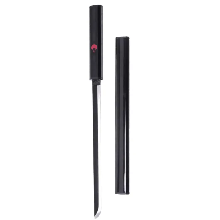 Es una réplica de la espada que lleva Sasuke Uchiha durante los episodios que mide un total de 45 cm y con la hoja de acero sin filo negra y vaina negra.