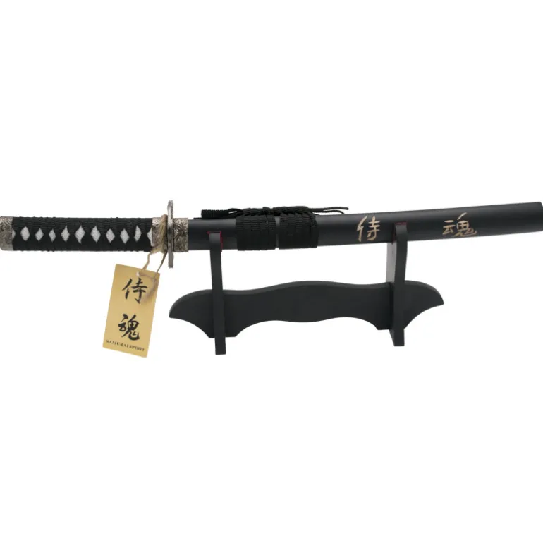 Mide un total de 45 cm y esta fabricada acero sin filo. Su diseño es una autentica pasada ya que a pesar de su tamaño no se pierde ni un detalle de esta maravillosa katana que viene con su vaina que tiene todo lujo de detalles en dorado con un grabado en el que pone «Espíritu» y además con soporte. Fíjate bien en las fotos para ver más detalles como los dibujos que tiene en la hoja y la funda.