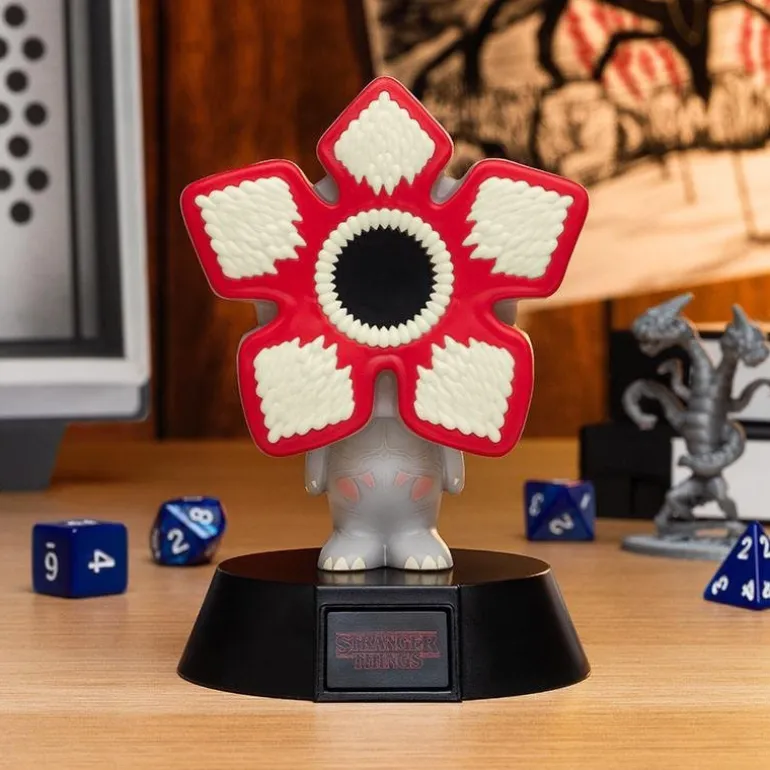 ¡Una pequeña lámpara de un demogorgon de Stranger Things! Mide aproximadamente 10 cm de alto y da una luz de ambiente realmente agradable, ideal para usar como quitamiedos.