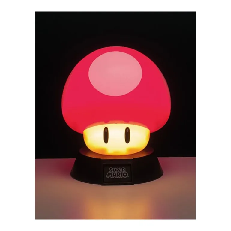 Una lámpara que reproduce a la perfección este icónico champiñón rojo, con sus ojitos y todo. Le dará a tu habitación o salón un aspecto realmente sorprendente tanto cuando está encendida como apagada. Mide aproximadamente 10 cm y da una luz rojiza ideal para crear ambiente o como luz nocturna. Funciona con dos pilas AAA (no incluídas) y cuenta con una peana con el logo de este legendario videojuego.