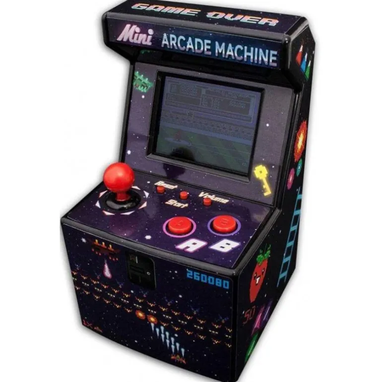 Se trata de una reproducción de unos 20 cm de una de esas máquinas arcade que tantas veces hemos visto en salones recreativos, con ese diseño tan clásico, y dos botones A y B más joystick, con la que podrás jugar a los más de 240 juegos de diferentes temáticas que la maquina incluye en su memoria. Todos ellos tienen un diseño retro para quienes saben apreciar el encanto de los píxeles y los 16 Bit, y te tendrán entretenido frente a la pantalla como en los viejos tiempos, pero en este caso con la ventaja de ser una pantalla LCD. No te pierdas además el espectacular diseño gráfico de la máquina en sí, que es todo un homenaje a las originales. Funciona con 3 pilas AA (no incluidas).