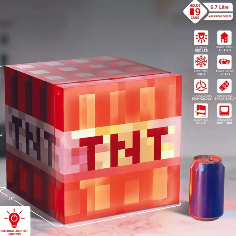 La Mini Nevera de Bloque TNT Minecraft fabricada por UKONIC ofrece una tecnología termoeléctrica fiable y eficiente para enfriar sin CFCs, garantizando un bajo impacto ambiental. Con una capacidad para 9 latas de refresco, y una capacidad interna de 6.7 L, esta mini nevera es perfecta para mantener tus bebidas frías durante horas.