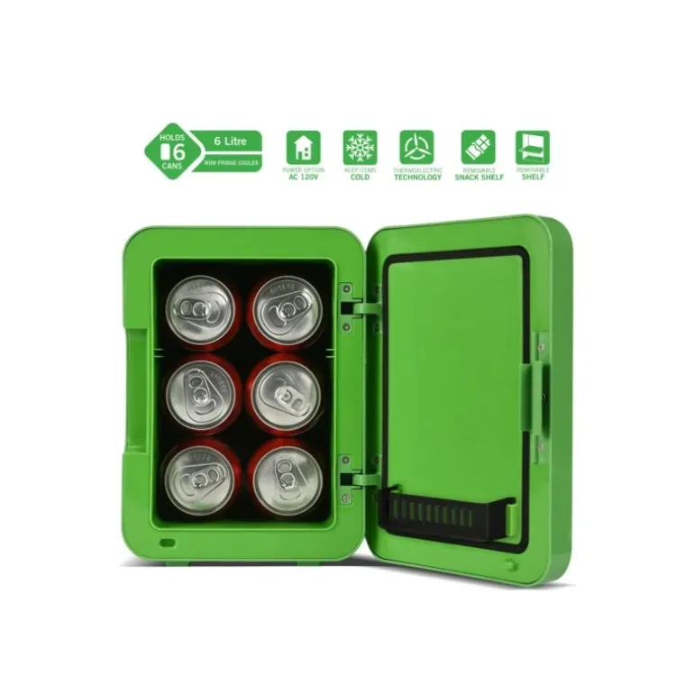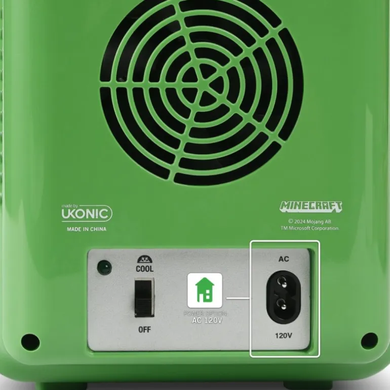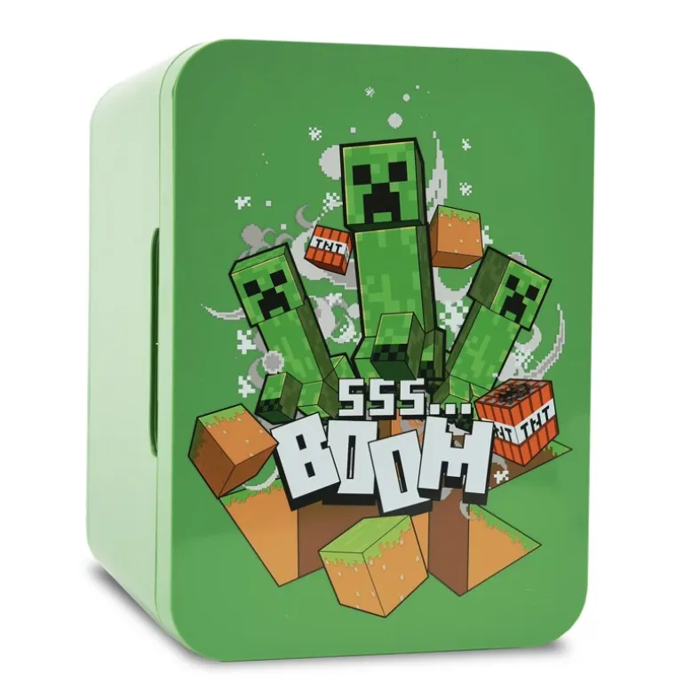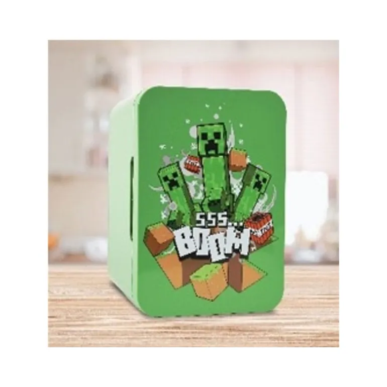 La Mini Nevera Minecraft 4L es el complemento perfecto para los fans del famoso juego. Con su diseño en vibrante color verde, destaca el icónico Creeper en la puerta frontal, acompañado de bloques y elementos característicos del juego.