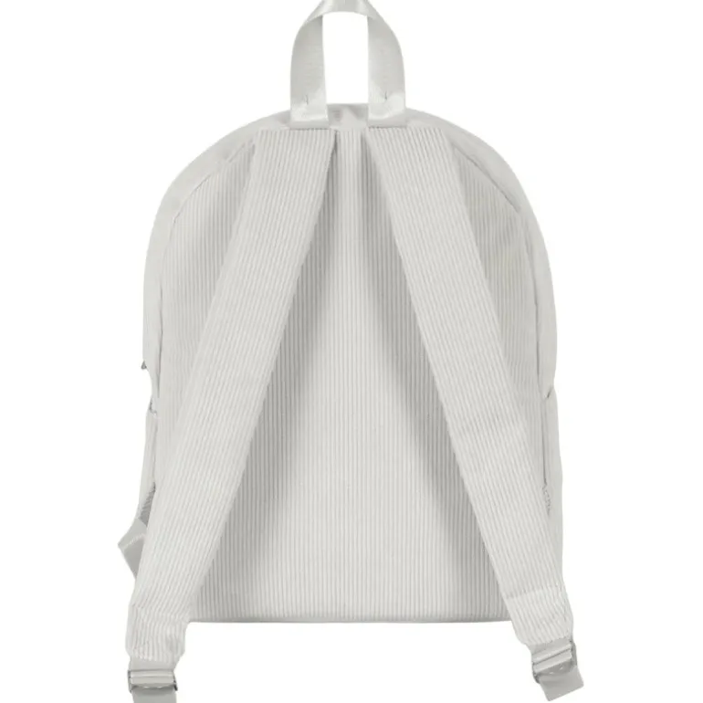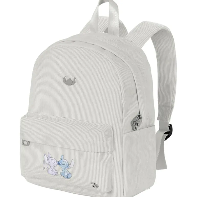 Con un cuerpo exterior de pana en un sereno color hueso, la mochila presenta un diseño adorable con los icónicos personajes de Lilo y Stitch en el bolsillo delantero. Este bolsillo se cierra con una cremallera, proporcionando un espacio seguro para tus pertenencias más pequeñas.