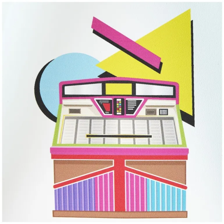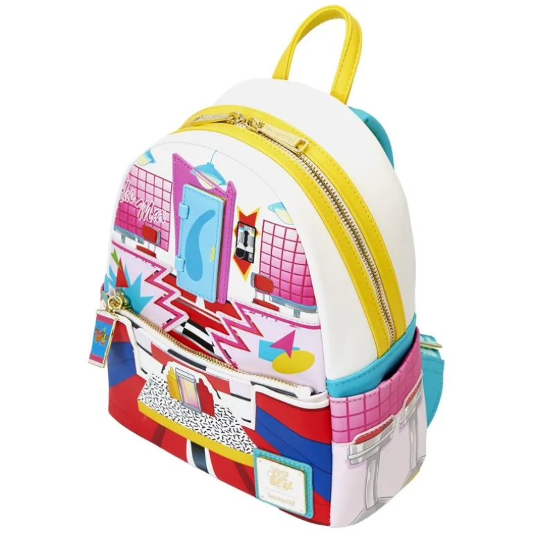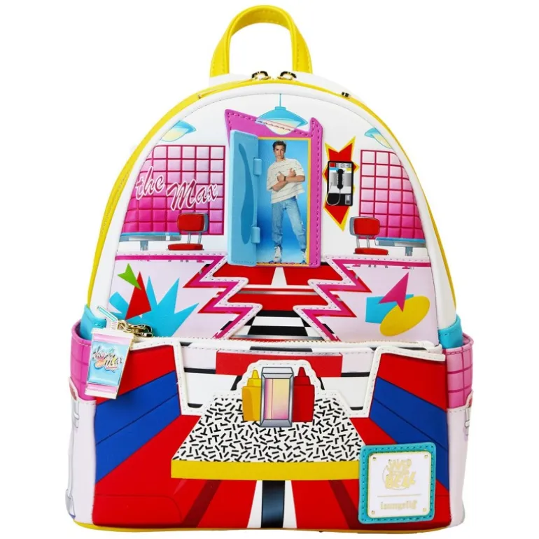 Descubre la mochila bolso The Max de Salvados por la Campana, un producto oficial de Loungefly que combina estilo y nostalgia. Este llamativo accesorio está decorado con un diseño colorido que evoca el famoso café de la serie. Predominan los colores blanco, amarillo, azul y rojo, creando un efecto visual vibrante y divertido.