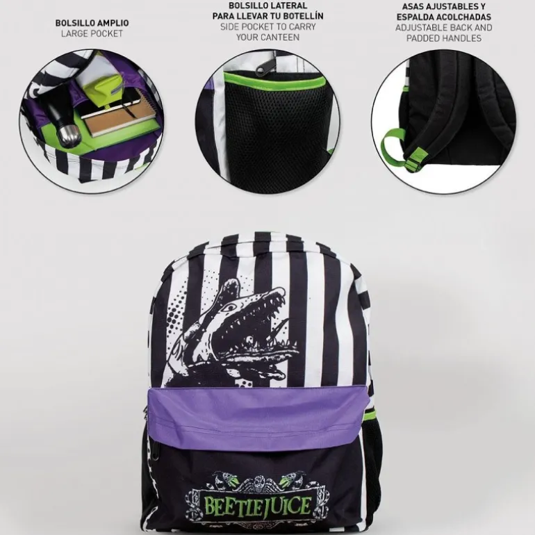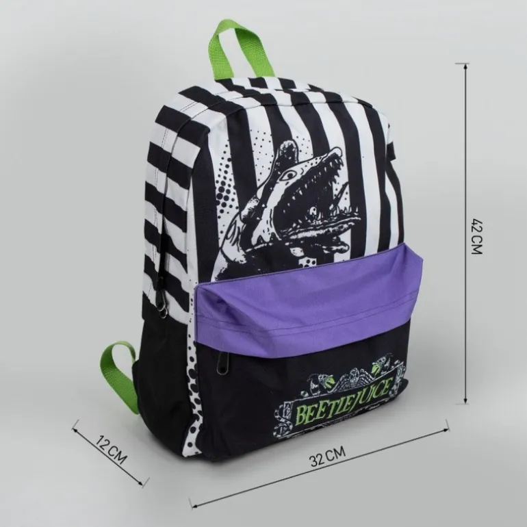 Descubre la mochila casual Beetlejuice, diseñada para los amantes del cine clásico y la originalidad. Esta mochila presenta un diseño atrevido con rayas blancas y negras que evocan al icónico traje del personaje, combinado con un vibrante bolsillo frontal en color púrpura. En la parte delantera, destaca una ilustración artística de una criatura, característica del universo Beetlejuice, junto al logo en el mismo tono púrpura.