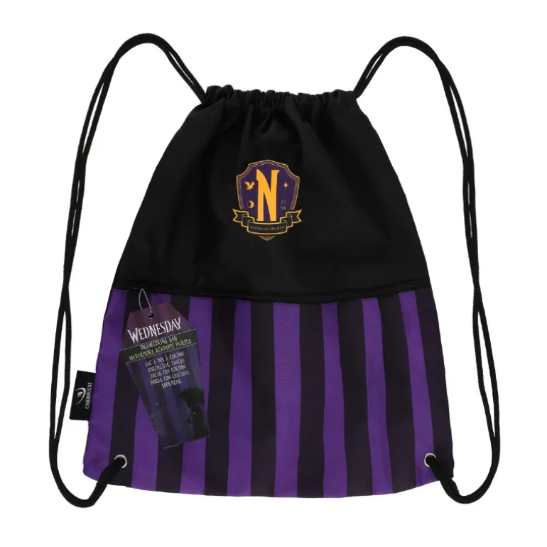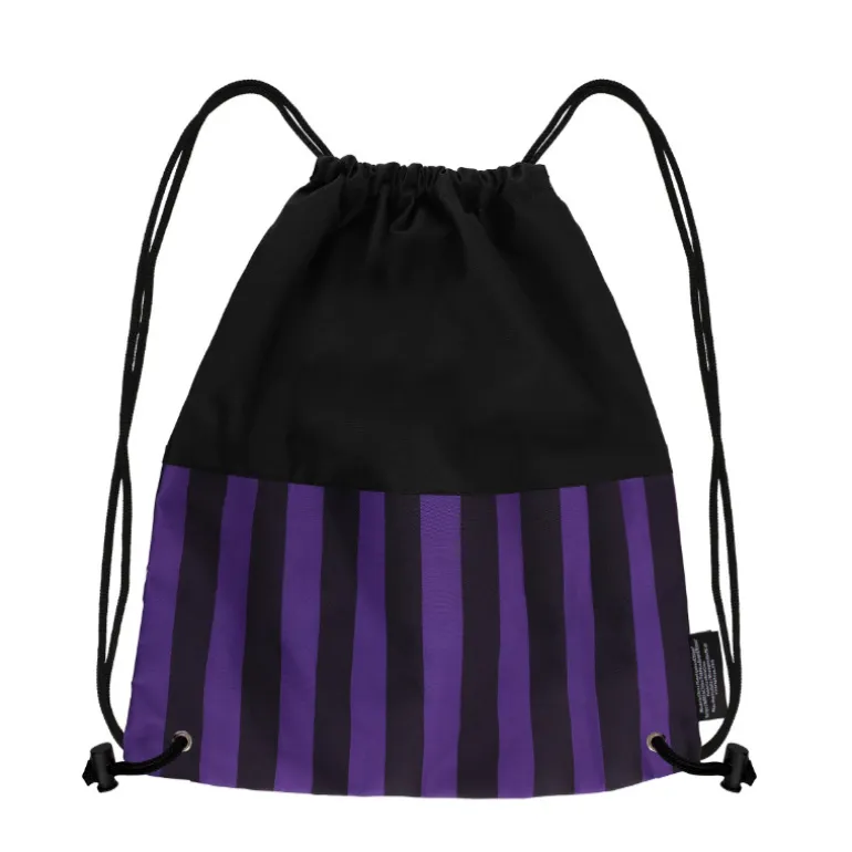Una mochilita tipo saco de los que se cierran con cuerdas, que no dejará indiferente a nadie que lo ve, basado en la nueva adaptación del clásico de la Familia Addams de Netflix: Miércoles.