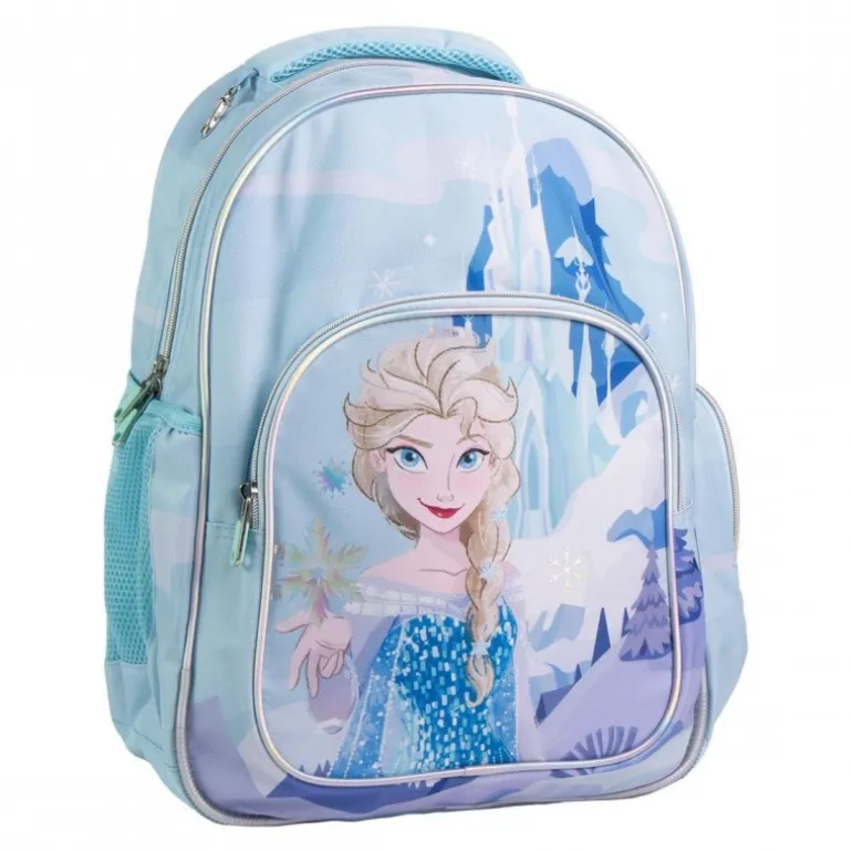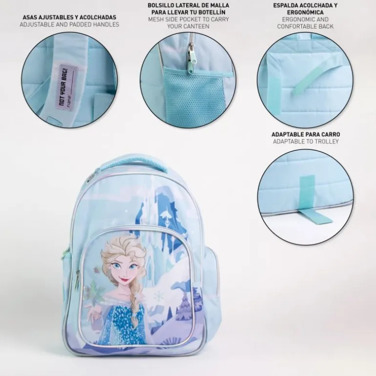 Descubre la mochila escolar inspirada en Frozen, ideal para los pequeños aventureros. Esta mochila de color azul claro presenta un diseño encantador con la imagen de Elsa del Reino de Hielo, destacando en su parte frontal. Hecha 100% de poliéster, ofrece una estructura duradera y resistente al uso diario.
