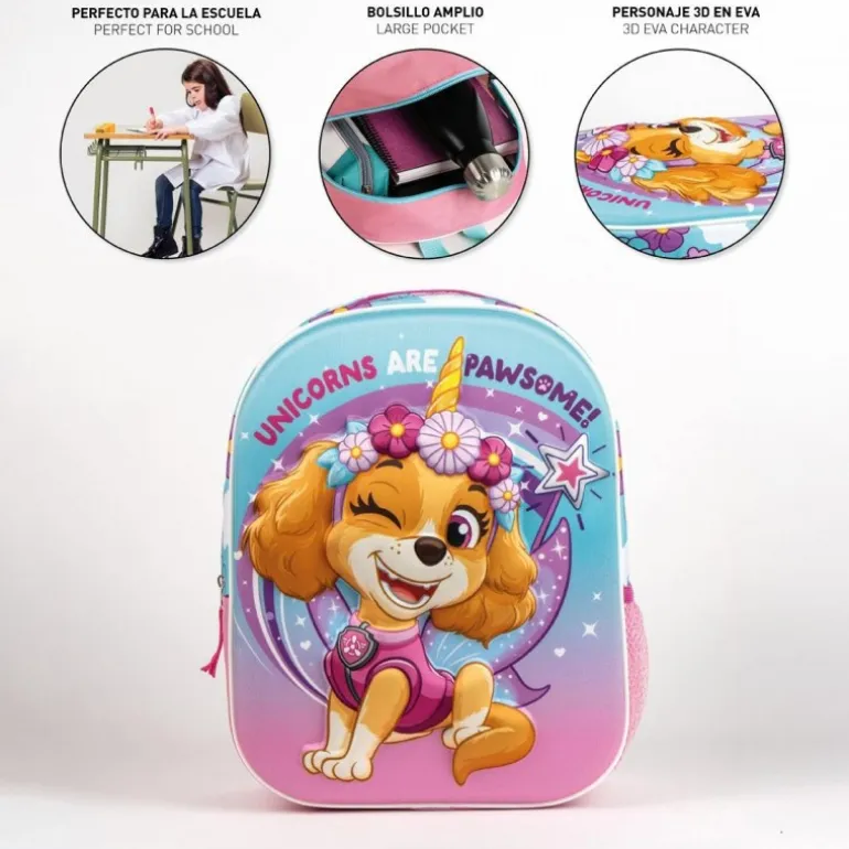 La mochila presenta una imagen en relieve 3D de Skye, el adorable personaje de Paw Patrol, con un diseño vibrante en tonos rosado y azul. La escena muestra a Skye luciendo un unicornio en su frente junto a un letrero que dice «Unicorns are pawsome!», rodeada de estrellas y flores que añaden un toque mágico.