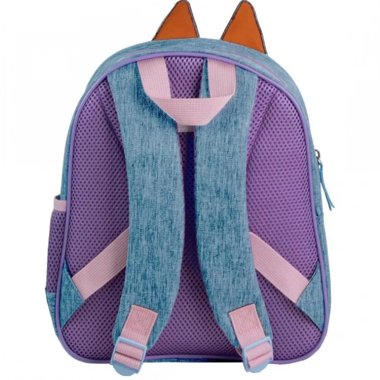 Descubre la mochila escolar infantil Bluey, ideal para los pequeños aventureros. Esta mochila está fabricada en 100% poliéster, garantizando durabilidad y resistencia. En su diseño, destacan los personajes de Bingo y Bluey, añadiendo un toque divertido y colorido con tonos azules y morados que encantará a los niños. Cuenta con un amplio bolsillo frontal perfecto para guardar útiles escolares. Las asas son ajustables y acolchadas, asegurando comodidad durante el uso diario, mientras que el respaldo ergonómico proporciona un soporte excelente. Además, incluye un bolsillo lateral de malla para llevar una botella de agua. Esta mochila es perfecta para el colegio, combinando funcionalidad y estilo, y es un regalo ideal para cualquier seguidor de Bluey.