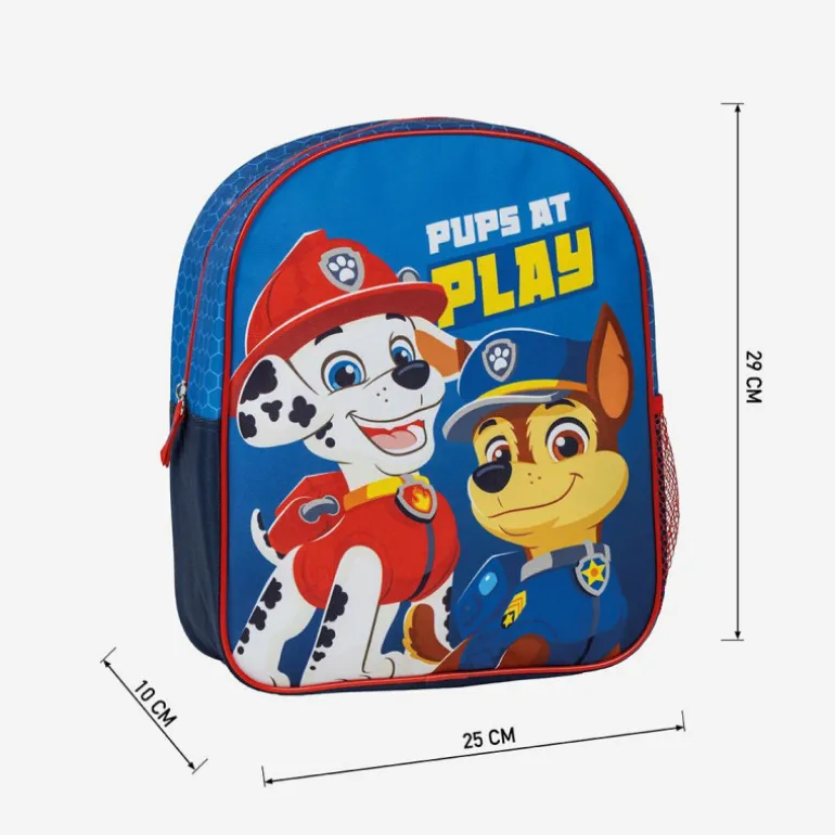 Descubre la mochila infantil ideal para los pequeños aventureros que adoran Paw Patrol. Esta mochila es de color azul vibrante y está adornada con los personajes favoritos de la serie, Marshall y Chase, en un diseño alegre con el texto «Pups at Play».