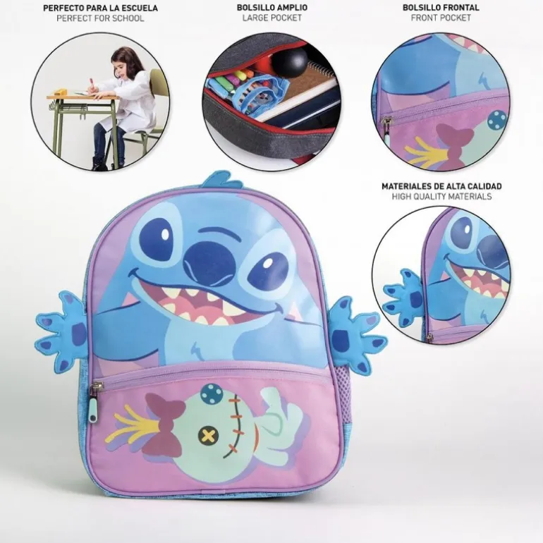 El diseño incluye brazos tridimensionales de Stitch que sobresalen, añadiendo un toque de alegría al estilo del pequeño. Con un amplio bolsillo frontal decorado con un motivo de muñeca de trapo y un espacioso compartimento principal, tus hijos tendrán suficiente espacio para sus libros y juguetes. Las asas son ajustables y acolchadas para un confort óptimo, mientras que la espalda ergonómica asegura un ajuste cómodo.