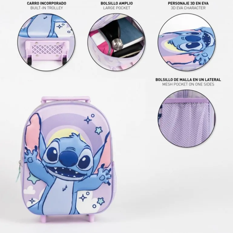 Descubre la mochila infantil trolley 3D de Stitch, un accesorio encantador para los más pequeños. Esta mochila presenta un vibrante diseño en tonos lila con un alegre personaje de Stitch en relieve 3D, que hará que tus hijos se entusiasmen al llevar sus cosas.
