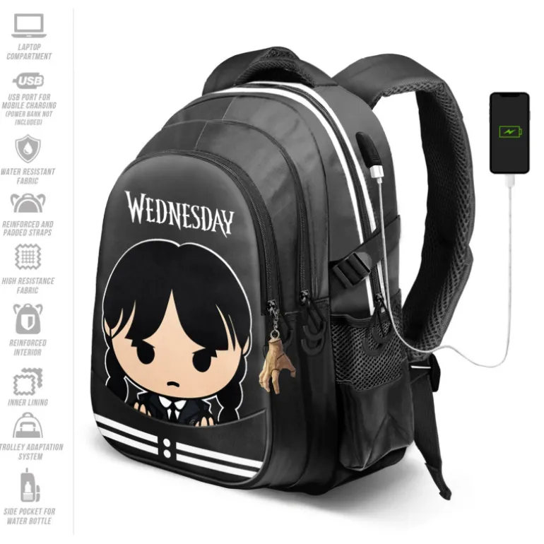 Con dimensiones de 21 x 34 x 46 cm, la mochila Miércoles Gris es un regalo original y útil para cualquier fan de Miércoles, ya que combina diseño exclusivo con funcionalidad. No solo es perfecta para el día a día, sino que además se convertirá en un accesorio imprescindible para tus aventuras y viajes.