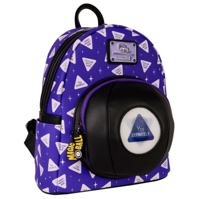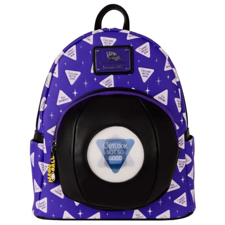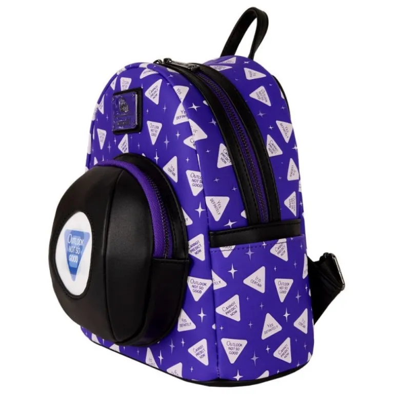 Descubre la Mochila Mini Magic 8 Ball de Mattel by Loungefly, una pieza única de alta calidad que encantará a los aficionados de la cultura pop. Esta mochila, con licencia oficial, está diseñada en un vibrante color púrpura adornado con motivos de la icónica bola 8 mágica. El material principal es una combinación de poliéster y cuero PU, que proporciona durabilidad y un acabado elegante.