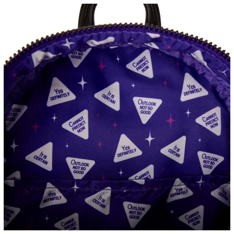 El interior está completamente forrado con detalles gráficos que repiten las frases de la bola mágica, asegurando que cada rincón de la mochila mantenga la temática de diversión y misterio. Las correas ajustables garantizan comodidad durante todo el día, mientras que el cierre de cremallera asegura la seguridad de tus pertenencias.