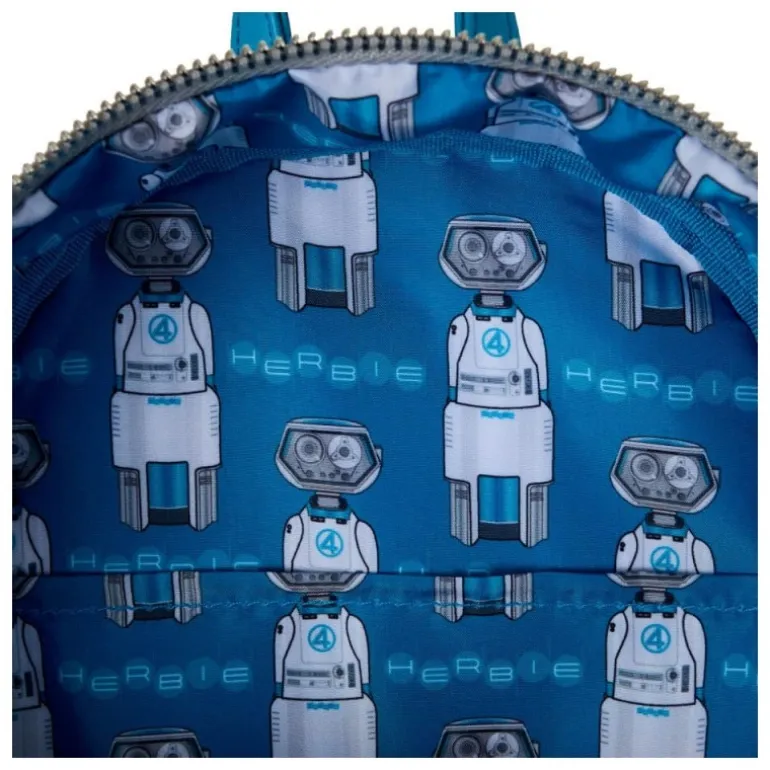 El diseño se inspira en los icónicos Fantastic Four, presentando un frontal que rememora los detalles tecnológicos característicos de los cómics. En el interior, el forro azul con estampado de H.E.R.B.I.E. añade un toque especial para los verdaderos seguidores del universo Marvel. Las correas y el manejo son fácilmente ajustables, lo que garantiza confort durante todo el día.