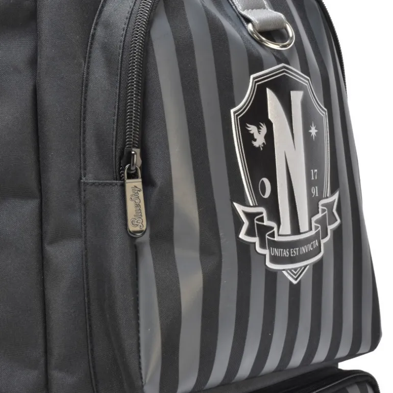 Descubre esta mochila oficial Nevermore, inspirada en el icónico personaje de Miércoles Addams. Con un diseño elegante a rayas en tonos gris y negro, esta mochila es ideal para quienes buscan destacar con un estilo único. En el frontal, luce un escudo distintivo que resalta su exclusividad.