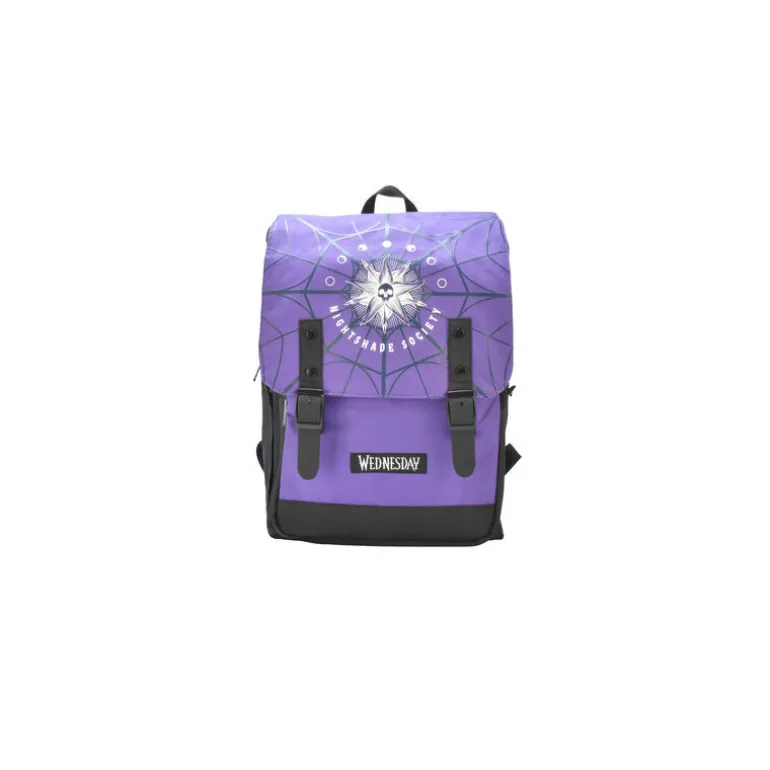 Descubre la Mochila Nightshade, un artículo imprescindible para los seguidores de Miércoles Addams. Esta mochila con licencia oficial destaca por su diseño único y llamativo. Presenta un color principal morado con detalles en negro, resaltando un impactante estampado de telaraña junto al emblema de la «Nightshade Society» en el frontal. Esta combinación de colores y detalles gráficos la hacen perfecta para quienes buscan un accesorio con estilo y personalidad.