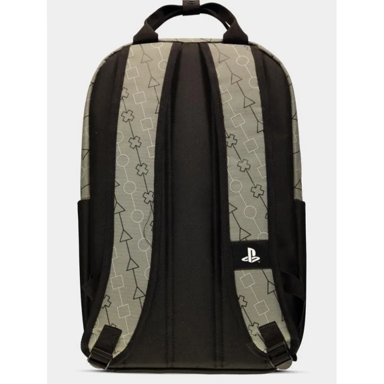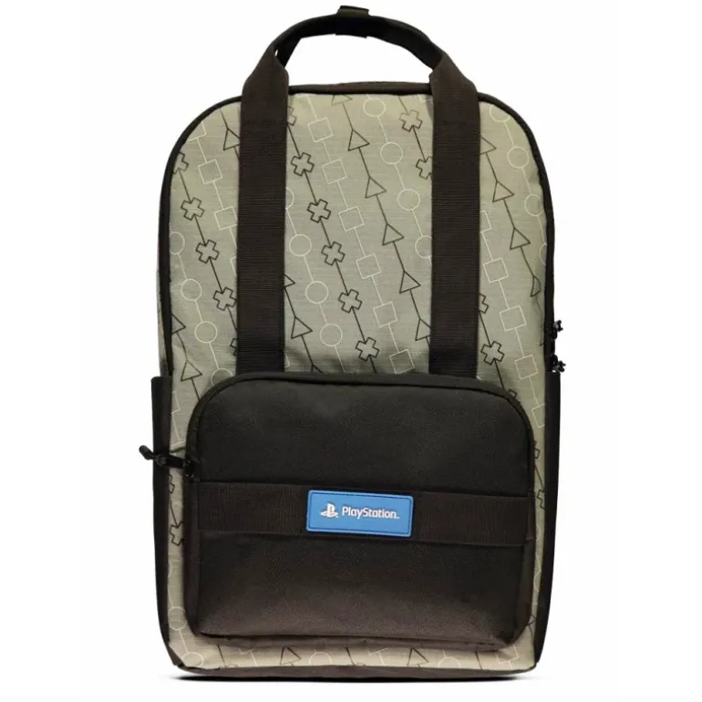 Pero sin duda lo mejor es su fantástico diseño, en una elegante combinación de colores grises y negro, un estampado formado por las formas geométricas que encontramos en el mando de la Play y el logo oficial de PlayStation sobre el bolsillo delantero de la mochila.
