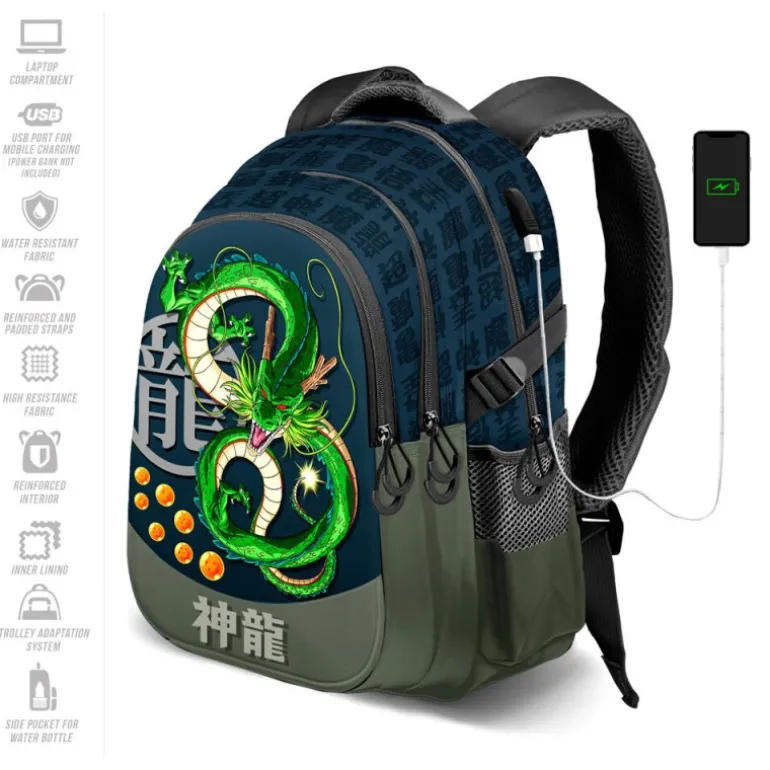 Uno de los aspectos más innovadores de la «Mochila Plus Shenron Dragon Ball» es su puerto USB. Esta característica permite cargar dispositivos móviles de manera práctica y eficiente al conectar un powerbank (no incluido), lo que resulta ideal para quienes se encuentran en movimiento constante y requieren de una carga rápida y accesible.
