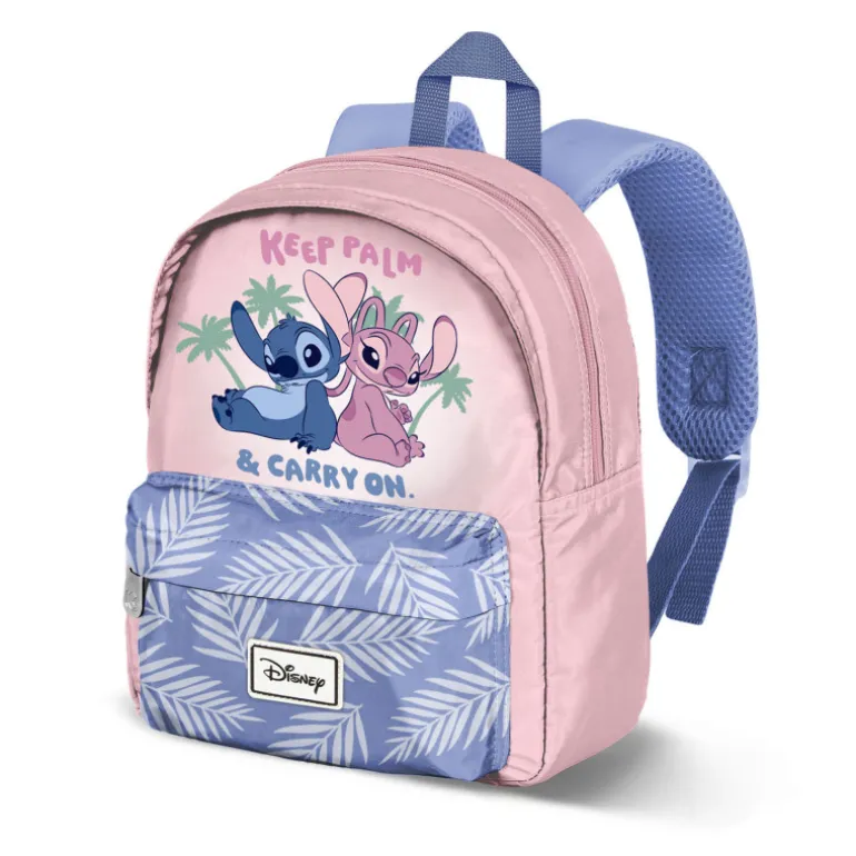 Descubre la mochila preescolar perfecta para los pequeños seguidores de Disney. Esta adorable mochila presenta un diseño encantador de Lilo y Stitch, con un fondo rosa suave y un vibrante estampado de los personajes principales rodeados de palmeras, junto al mensaje «Keep Palm & Carry On».
