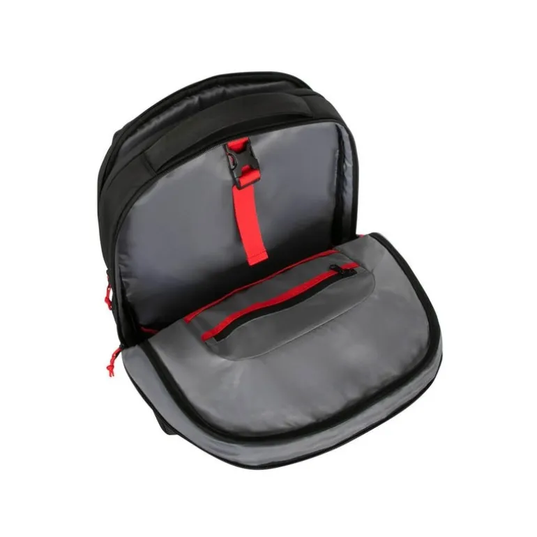 La Mochila Targus Strike II Gaming es el accesorio perfecto para los gamers que buscan funcionalidad y estilo. Diseñada para portátiles de hasta 17.3 pulgadas, esta mochila combina un elegante diseño monocromático en color negro con detalles en rojo, brindando un aspecto moderno y dinámico.