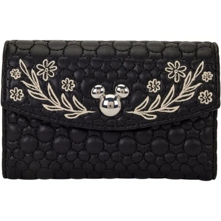 El exterior del monedero presenta un diseño bordado de flores y ramas, acompañado del icónico botón metálico de Mickey Mouse, añadiendo un toque de elegancia. Por dentro, encontrarás múltiples compartimentos para tarjetas y un espacio especialmente diseñado para tus identificaciones, además de un forro con dibujos de Mickey en tonos oscuros que añade un detalle encantador.