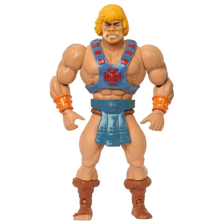 He-Man luce un atuendo dinámico, con una armadura azul y detalles en rojo. Viene equipado con accesorios, incluyendo una capa verde y piezas de armadura adicionales que le otorgan un aspecto aún más imponente. La figura es totalmente articulada, permitiendo recrear épicas poses de combate.