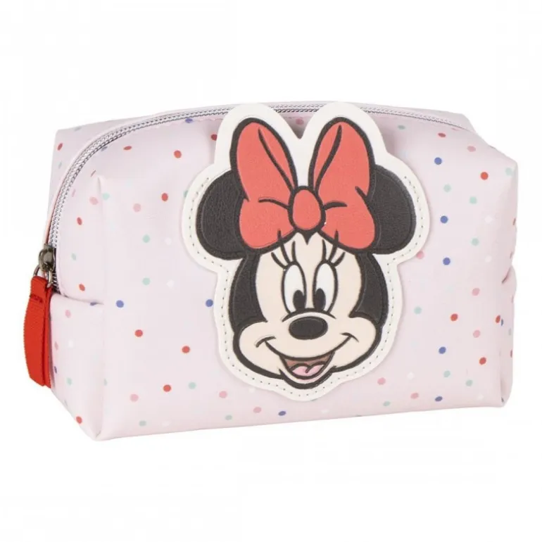 La cara de Minnie Mouse, con su icónico lazo rojo, se destaca en el frente del neceser, capturando la esencia divertida y juguetona del personaje que tanto encantará a las niñas. El cierre es seguro y fácil de usar, gracias a su cremallera de metal con un tirador rojo, haciendo que abrir y cerrar sea una tarea sencilla para las más pequeñas.