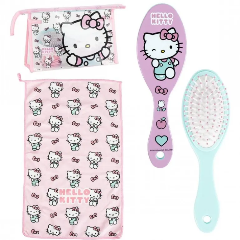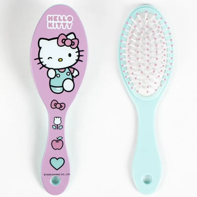 - Cepillo de Pelo: Con fondo lavanda y un diseño ergonómico, presenta a Hello Kitty y pequeños detalles como flores y corazones, haciendo del cepillado una experiencia divertida.
