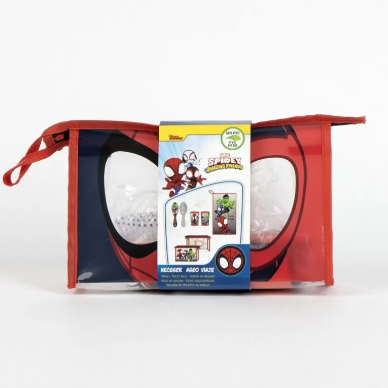 Este neceser de aseo de viaje inspirado en Spidey es el compañero perfecto para los pequeños aventureros. Con un diseño vibrante y llamativo, presenta el icónico rostro del héroe arácnido en tonos rojo y azul, perfecto para los fans de los cómics.