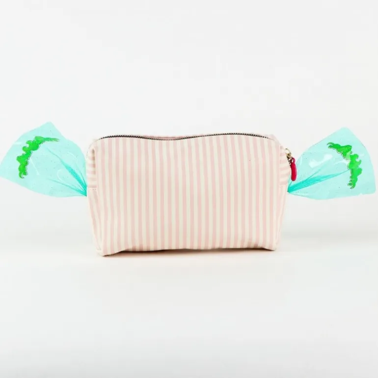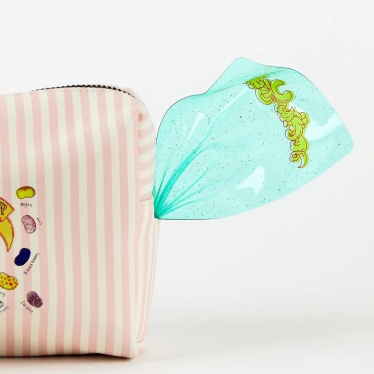 El interior del neceser está decorado con un vibrante estampado de grageas de diversos colores, añadiendo un toque mágico y divertido a tu rutina de viaje. Sus dimensiones generosas ofrecen suficiente espacio para guardar todos tus artículos de baño y maquillaje, ideal para cualquier escapada.