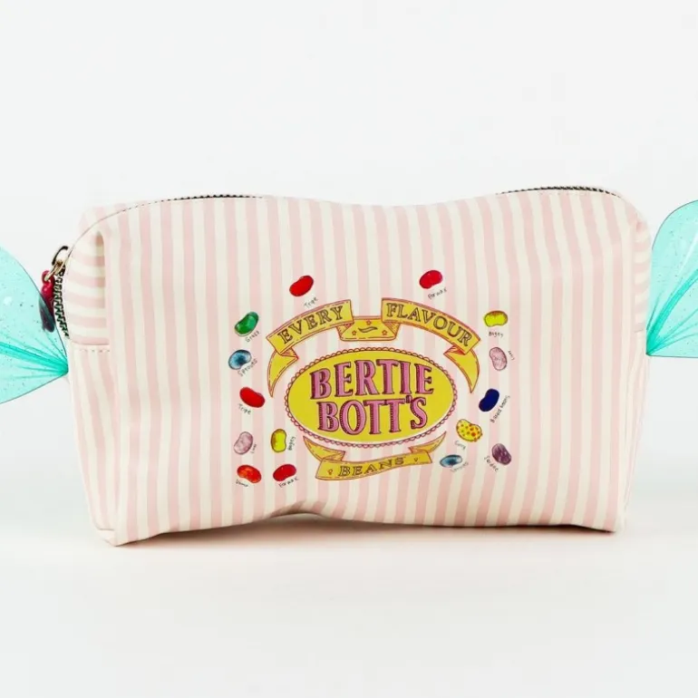 Este neceser de aseo de polipiel inspirado en Harry Potter Honeydukes es un accesorio indispensable para los fanáticos de la saga. Con un diseño que emula una dulce envoltura de caramelos Bertie Bott’s, este neceser presenta un patrón de rayas verticales en tonos rosa claro y detalles en relieve de las grageas de todos los sabores. Está fabricado en 100% poliuretano, lo que garantiza su resistencia y durabilidad.