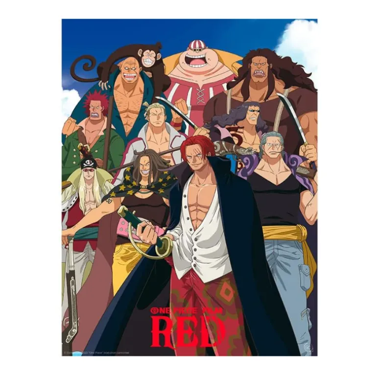 El diseño de este poster presenta a los piratas pelirojos, personajes icónicos y emblemáticos de la película One Piece RED. Los piratas pelirojos, liderados por el legendario Shanks, son conocidos por su valentía y audacia en alta mar.